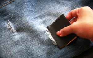 - يتم فرد الجينز على سطح مستوٍ ، وتوضع قطعة من الورق المقوى الصلب أسفل المناطق المحددة من الداخل ، وهذا ضروري حتى لا يتغلغل البياض في الجينز من الجزء الأمامي والخلفي للساق ؛