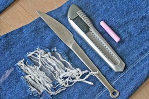 - بعد ذلك ، باستخدام الشفرة ، ارسم بعناية خطين متوازيين على طول اللحامات اليمنى واليسرى لتحرير ألياف القماش.