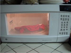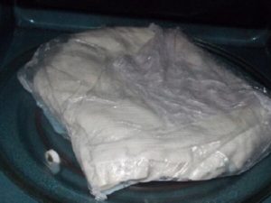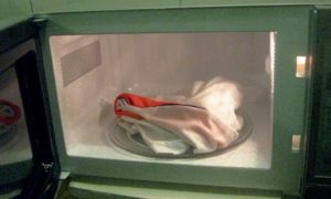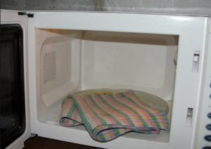 - ثم يتم لف القماش في كيس ووضعه في الميكروويف ، وبعد ذلك يتم تشغيل الوحدة لمدة 1.5 دقيقة من التشغيل.
