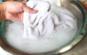 - أولاً ، تُنقع المنشفة بالماء والصابون بشكل صحيح - من الضروري أن تشبع القماش تمامًا ؛