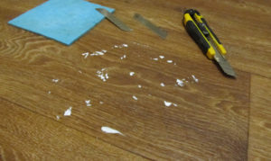 - Besonders hartnäckiger Schmutz kann mit einem Rasiermesser oder einem dünnen Messer vorsichtig abgekratzt werden. Dies muss jedoch mit sehr vorsichtigen Bewegungen erfolgen, wobei darauf zu achten ist, dass die Klinge nur die Oberfläche des Schmutzes berührt, nicht den Boden.