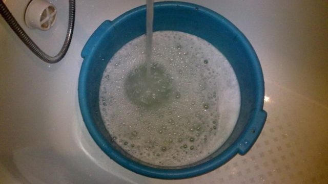 - Gießen Sie etwas Wasser in ein Becken und geben Sie eine kleine Menge Waschmittel hinzu, damit die Lösung nicht zu konzentriert wird.
