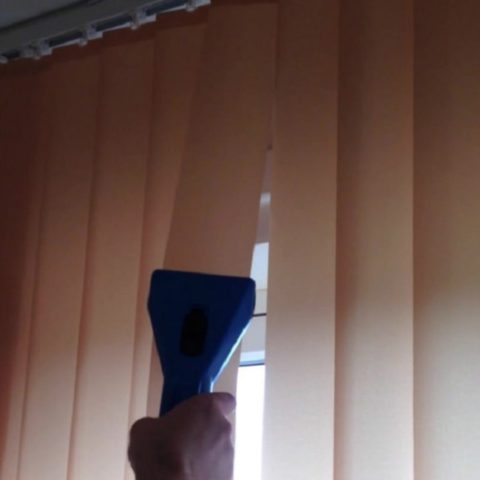 Es ist nicht immer möglich, das Waschen manuell oder automatisch durchzuführen. In solchen Fällen können die Vertikaljalousien im Büro gereinigt werden, ohne sie von der Traufe zu entfernen. Diese Methode gilt als die heikelste, aber arbeitsintensivste.