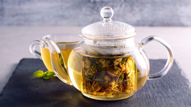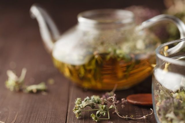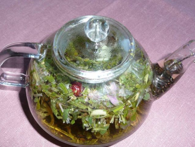 - Zwei große Esslöffel trockene Blätter werden zerkleinert und in ein Glas heiße Flüssigkeit gegossen.