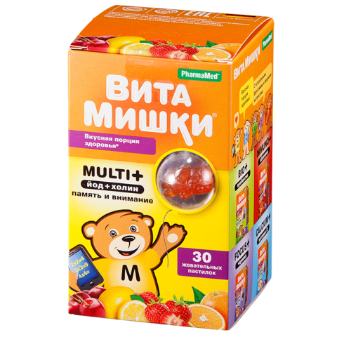 Vita Mishki ist eines der besten Multivitamine aus Deutschland. Die Form der Freisetzung ist Kaugummi mit Orangen-, Kirsch-, Erdbeer- und Zitronengeschmack. Die in der Zusammensetzung für Kinder ab 3 Jahren enthaltenen B-Vitamine zielen darauf ab, Intelligenz, Aufmerksamkeit und Gedächtnis zu entwickeln.