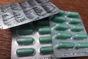 In Apotheken gibt es Retinorm nur in einer Form. Das Medikament wird in Kapseln von jeweils 500 mg hergestellt, während die Kapseln in Blasen von 10 Stück, 3 oder 9 Blasen pro Packung gesammelt werden.
