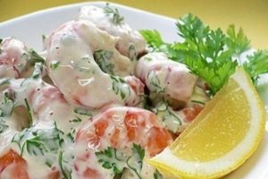 Nur gekochte Garnelen sind vorteilhaft und werden ohne überschüssiges Salz, Gewürze und Zitronensaft serviert, was die Magenwände reizt und die Sekretion von Magensaft erhöht. In einem Salat mit gekochten Erbsen serviert, bringen verschiedene Gemüsesorten, gedämpfte oder gekochte Garnelen aufgrund ihrer Eigenschaften nur Vorteile.