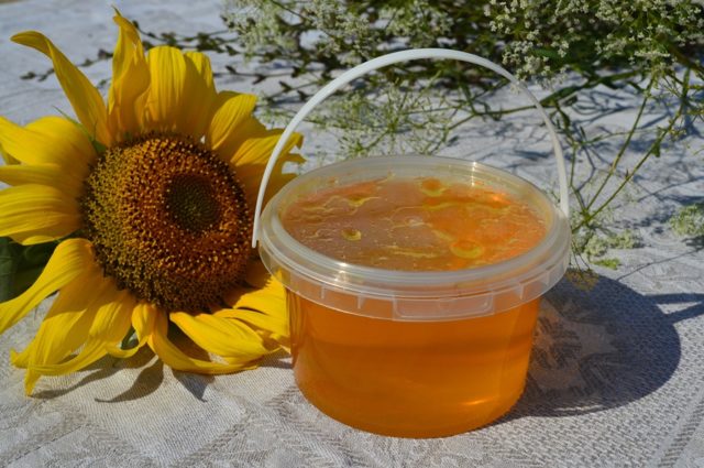 Die wohltuenden Eigenschaften von Sonnenblumenhonig wirken sich stark positiv auf die Haut aus. Das Produkt wirkt feuchtigkeitsspendend und regenerierend, verbessert die Durchblutung der Epidermisschichten und normalisiert den Lymphfluss. Es wird aktiv in Gesichtsmasken verwendet, für die Anti-Cellulite-Massage verwendet und mit Haarpflegemitteln gepflegt. Das Produkt ist universell einsetzbar, da es die trockene Epidermis mit Feuchtigkeit versorgt und die Produktion von subkutanem Talg bei fettigen Hauttypen normalisiert.