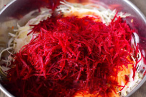 In der ersten Phase wird das Gemüse gehackt und der Stiel entfernt. Fügen Sie gehackte Karotten, Paprika, Rüben, Beeren und andere Zutaten hinzu, um zu schmecken.