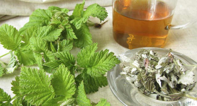 - zwei große Esslöffel trockene Blätter gießen 250 ml kochendes Wasser;
