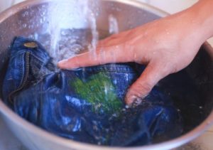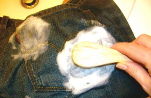 - Мръсното място се третира с разтвор на сода и дънките се измиват в топла вода.