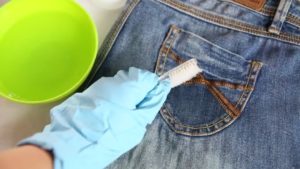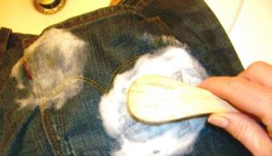 - Преди да използвате домакински препарати за премахване на петна, трябва да се уверите, че в състава няма хлор, в противен случай се осигурява появата на белезникави петна по дънките.