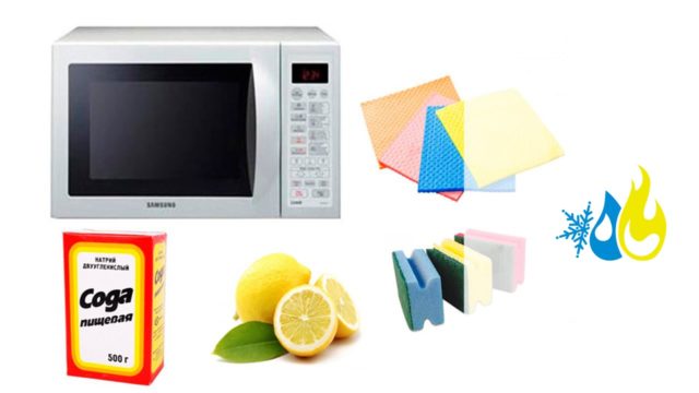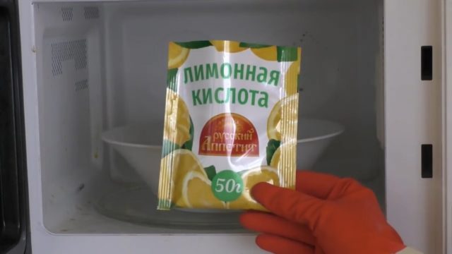 В дълбок съд смесете половин литър вода и сока от 1 лимон, добавете чаена лъжичка натриев бикарбонат. Ястията се поставят в микровълновата печка и се поставят на средно ниво. Продължителността на микровълновата фурна е половин час. След това устройството се изключва от контакта и се почиства с гъба.