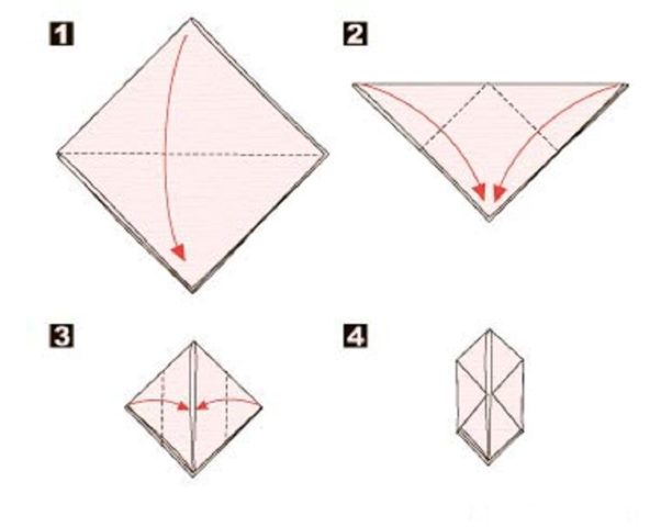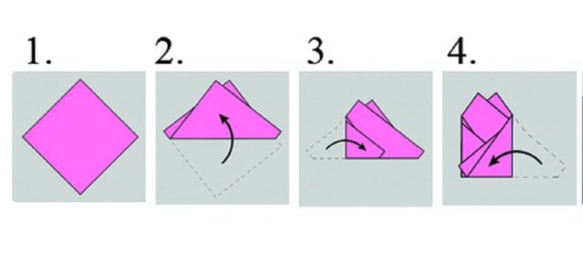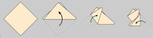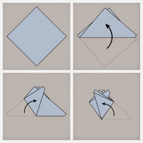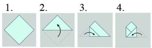 - След това левият и десният ъгъл са огънати към долния връх, така че да се образува ромб.
