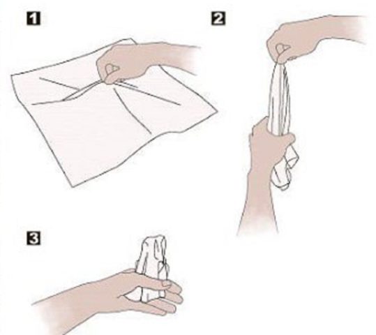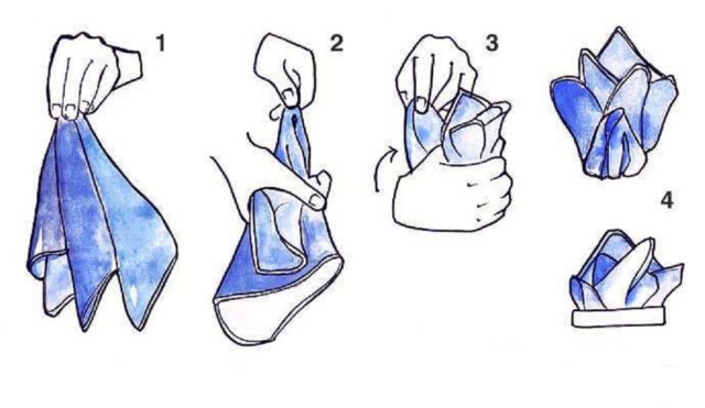 - Кърпичката се хваща от центъра на плата и се повдига така, че краищата й да висят свободно.