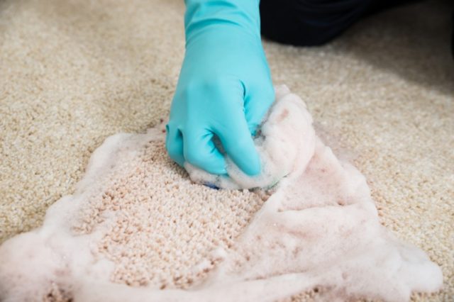 Процедурата се извършва с ръкавици. Първо, важно е да проверите ефективността и безопасността на съединението върху незабележима област от килима.