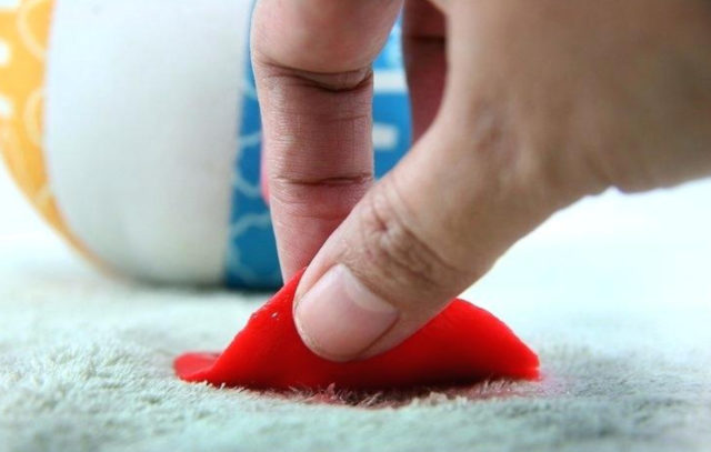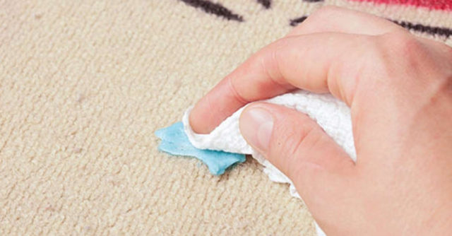 Ако играчката не бъде незабавно отстранена от повърхността, тя се абсорбира в купчината и изсъхва. В такива случаи не е необходимо да избирате химическо почистване с помощта на професионални продукти. Можете да опитате сами да измиете изсъхналата слуз от килима.