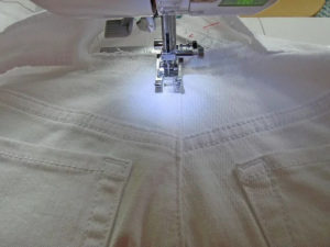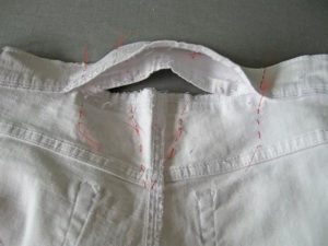 Друг метод, който ще ви позволи да шиете дънки в колана със собствените си ръце, включва работа със задния шев, следвайки инструкциите стъпка по стъпка.