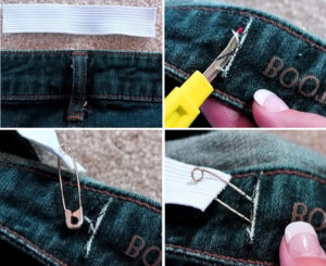 Някои дънки са най-добре пришити отстрани. В този случай ластикът трябва да се приложи от двете страни, като повтаря напълно предишния алгоритъм на действие. В този случай е изключително важно да се спазва пропорционалността: затягането в кръста трябва да се извършва паралелно.