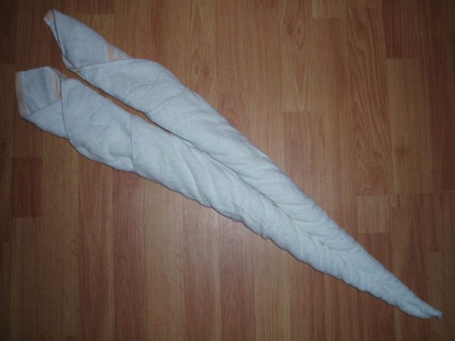 - За да направите това, трябва да подготвите две средни кърпи от един и същи цвят. Един от тях също е разположен на хоризонтална повърхност, определя се средата и ролките се усукват с опън от двете страни.