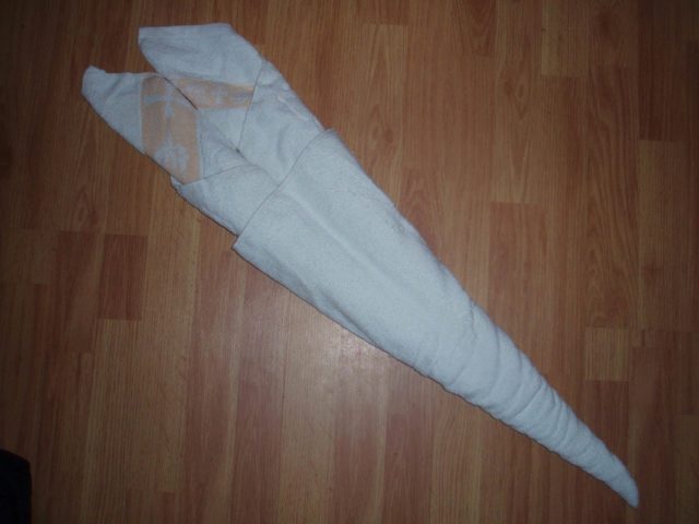 При желание фигурата може да остане непроменена, тя се счита за напълно завършена - За да завършат опашката, те също вземат кърпа със същия размер или малко по-малка. Сгънете го като акордеон по цялата дължина.