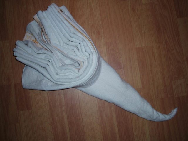 Изработването на форма на кърпа под формата на лебед със собствените си ръце не е трудно. За да направите това, трябва да подготвите средно голяма кърпа, за предпочитане хавлиена или дебела кърпа. Трябва да се измие и изглади, тъй като няма да работи нито веднъж с използвания. Желателно е да изберете светъл нюанс, в идеалния случай бял.