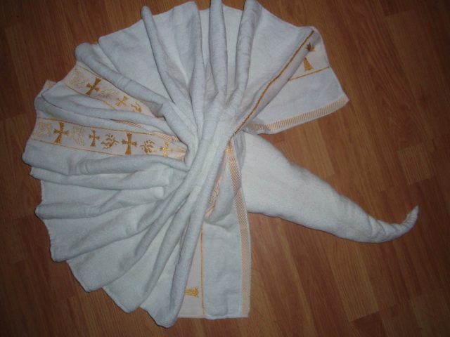 Фигурите с кърпи са много необичаен начин за представяне на предмети за лична хигиена. Но се получава толкова красиво, че тази идея се използва в различни части на света. Пример за това са снимките по-долу.