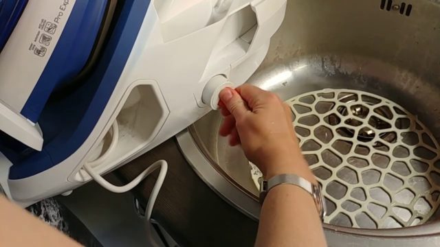 След пълно изпразване на резервоара вода се излива в контейнера на устройството. Течността се източва след 15 минути.