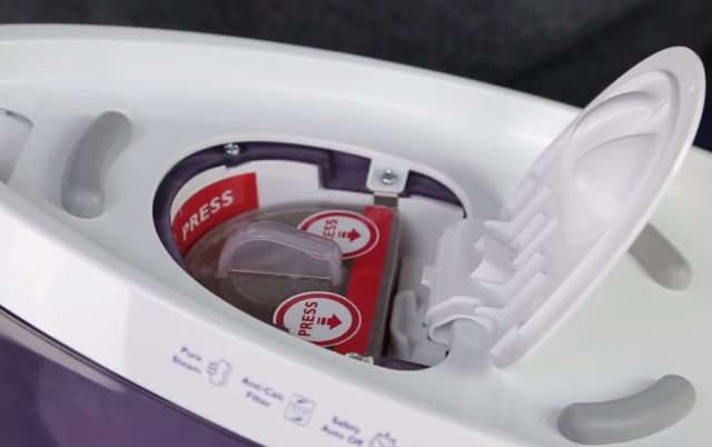 За да се премахнат солевите отлагания, в резервоара се излива специален разтвор. Течността съдържа 1 чаена лъжичка лимонена киселина и 350 мл топла вода. Продължителността на действието на продукта е 25 минути, след което е необходимо да включите режима на подаване на пара. Памучната тъкан трябва да се глади, докато водата се изпари напълно.