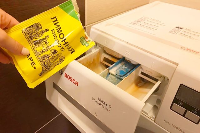 - σύμφωνα με την κλασική συνταγή για τον καθαρισμό του πλυντηρίου, το κιτρικό οξύ χύνεται σε ένα συρτάρι σε ποσότητα 200 g.