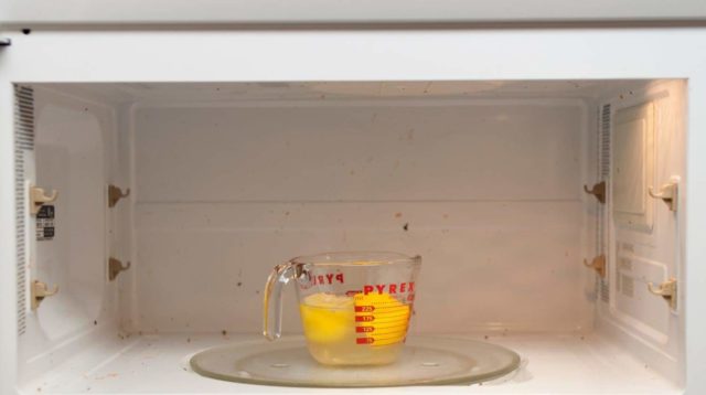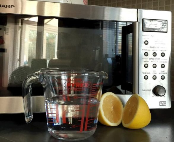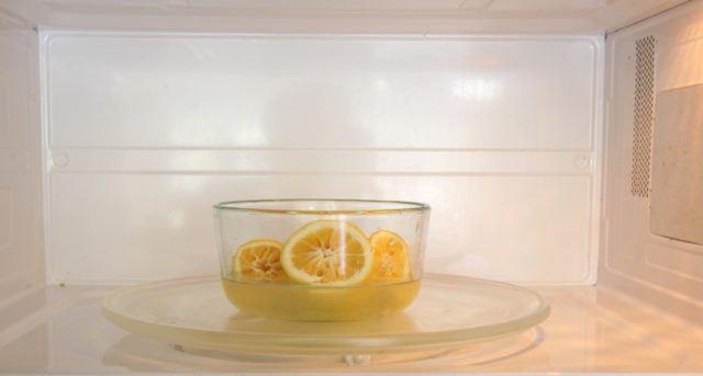 Αυτή είναι μια πιο ήπια μέθοδος που χρησιμοποιείται για την απομάκρυνση διαφόρων ρύπων. Χυμός λεμονιού χύνεται σε μια πλάκα που προορίζεται για χρήση σε φούρνο μικροκυμάτων και νερό (250 ml) και προστίθεται ξύσμα. Η ισχύς έχει ρυθμιστεί σε μεσαία. Η διάρκεια του φούρνου μικροκυμάτων είναι 5 έως 10 λεπτά.