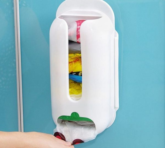 Μπορείτε να κρεμάσετε την τσάντα σε εμφανές μέρος, αυτή η μέθοδος αποθήκευσης θα διακοσμήσει επίσης την κουζίνα - Κουτί από χαρτόνι... Κόψτε μια τρύπα στο καπάκι για να βγάλετε σακούλες μίας χρήσης. Για να αποθηκεύσετε προϊόντα, μπορείτε να χρησιμοποιήσετε κουτιά ιστών.