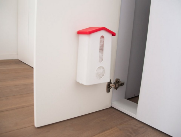 Στη μέση υπάρχει ένα κυρτό στοιχείο, κατά μήκος του περιγράμματος του οποίου μπορείτε να κόψετε μια τρύπα, οπότε είναι βολικό να βγάζετε πακέτα και δεν χρειάζεται να ανοίγετε το καπάκι κάθε φορά - Πλαστικό μπουκάλι... Πάρτε ένα δοχείο με όγκο τουλάχιστον 1 λίτρο. Κόψτε το κάτω μέρος και την κορυφή σε απόσταση 5 cm από το λαιμό. Κολλήστε την αυτοδημιούργητη συσκευή σε ταινία διπλής όψης στο εσωτερικό της πόρτας ή βιδώστε την με βίδες αυτόματης τοποθέτησης. Φυλάσσετε τις συσκευασίες σε πλαστική φιάλη σε ρολό.