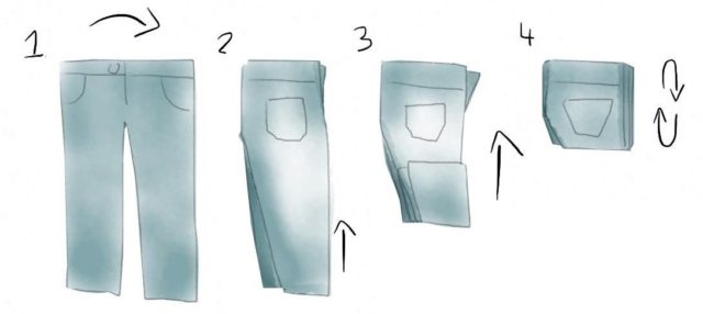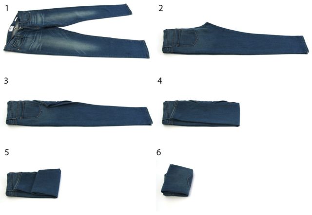 Κατά το πτυσσόμενο παντελόνι ή το τζιν, πρέπει να αποφύγετε τις ρωγμές κοντά στις ραφές, προκαλούν αντιθέσεις με ρίγες. Είναι καλύτερα να αναδιπλώσετε ένα πράγμα σε ορθογώνιο, έτσι ώστε να είναι λιγότερο παραμορφωμένο. Μην διπλώνετε διαγώνια, διαφορετικά μπορεί να σχηματιστούν πτυχές, κάτι που θα είναι αδύνατο να ξεφορτωθείτε.