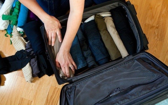 Βάλτε τα τζιν διπλωμένα στο μισό στο κάτω μέρος μιας κενής βαλίτσας - Γεμίστε το χώρο, προσπαθώντας να διπλώσετε τα πάντα όσο πιο συμπαγή γίνεται.
