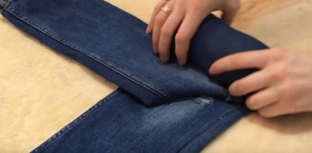Διπλώστε τζιν, ισιώνοντας ραφές και πτυχώσεις - Στη συνέχεια, λυγίστε το πάνω άκρο, χωρίς να φτάσετε στο γόνατοΚάντε το ίδιο με το κάτω μέρος του παντελονιού. Διπλώστε τα ξανά, φτάνοντας στη μέση.