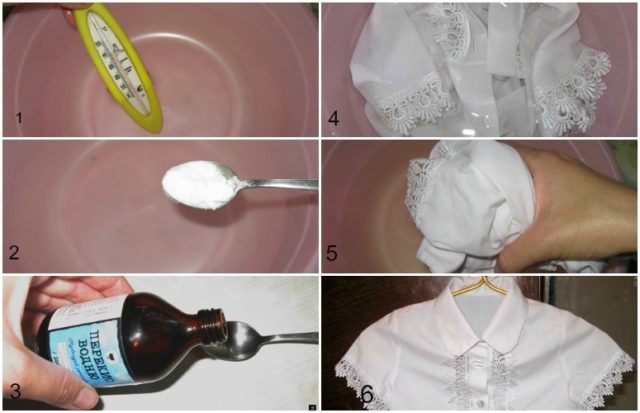 Η λεύκανση λευκών βρεφικών ρούχων και πετσετών τσαγιού με υπεροξείδιο του υδρογόνου και μαγειρική σόδα δίνει εξαιρετικά αποτελέσματα. Αυτό το μείγμα λειτούργησε καλά με τις νοικοκυρές. Για 2 λίτρα νερού με θερμοκρασία 30 ° C προσθέστε 1 κουταλάκι του γλυκού. υπεροξείδιο και 1 κουταλιά της σούπας. μεγάλο. ανθρακικό νάτριο. Λευκά αντικείμενα τοποθετούνται στο μείγμα για 10 λεπτά και πλένονται καθημερινά.