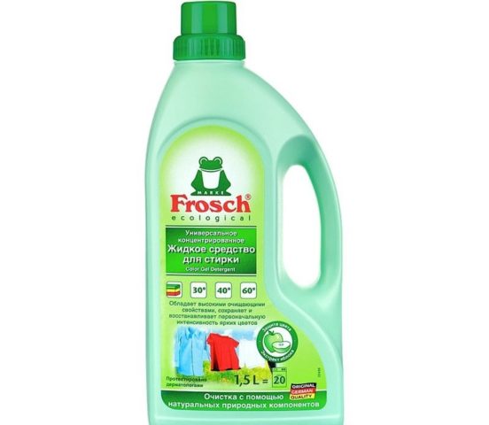 - Το "Frosch" είναι ένα πολύ ήπιο υγρό απορρυπαντικό που σας επιτρέπει να πλένετε μέτρια βρωμιά, είναι απαλό σε οποιοδήποτε ύφασμα.