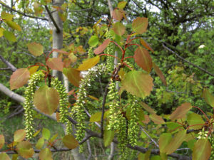 Το φυτό ανθίζει τον Απρίλιο, πριν εμφανιστούν τα πρώτα φύλλα. Τα μικρά λουλούδια σχηματίζουν ταξιανθίες με τη μορφή σκουλαρίκια, τα οποία χωρίζονται σε αρσενικά και θηλυκά. Τα ανδρικά σκουλαρίκια είναι μακριά (13-15 cm) και έχουν πιο έντονο μπορντό χρώμα, ενώ τα γυναικεία σκουλαρίκια είναι πρασινωπά και κοντά. Στο τέλος της περιόδου ανθοφορίας, τα μικρά φρούτα σχηματίζονται με τη μορφή κουτιού σπόρου, κομμένα με χνούδι.