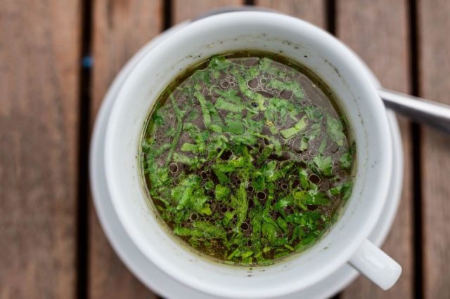 - δύο μεγάλες κουταλιές ξηρών φύλλων του φυτού συνθλίβονται.