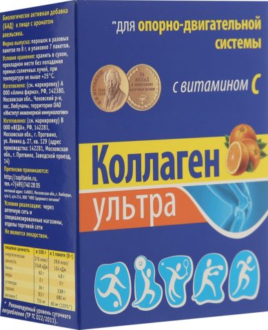 Το Collagen Ultra με βιταμίνη C διατίθεται σε μορφή σκόνης. Έχει αναλγητικές και αντιφλεγμονώδεις ιδιότητες και επίσης αυξάνει την κινητικότητα των αρθρώσεων. Το συμπλήρωμα διατροφής συνιστάται για χρήση σε περίπτωση τραυματισμών, αλλαγών που σχετίζονται με την ηλικία και για γενική ενίσχυση του σώματος. Αντιμετωπίζει αποτελεσματικά τα εύθραυστα νύχια, την τριχόπτωση και τη μειωμένη ελαστικότητα του δέρματος. Η σκόνη αραιώνεται σε ½ κουταλιά της σούπας. χυμός ή γάλα. Η ρεσεψιόν πραγματοποιείται μία φορά την ημέρα με γεύματα.