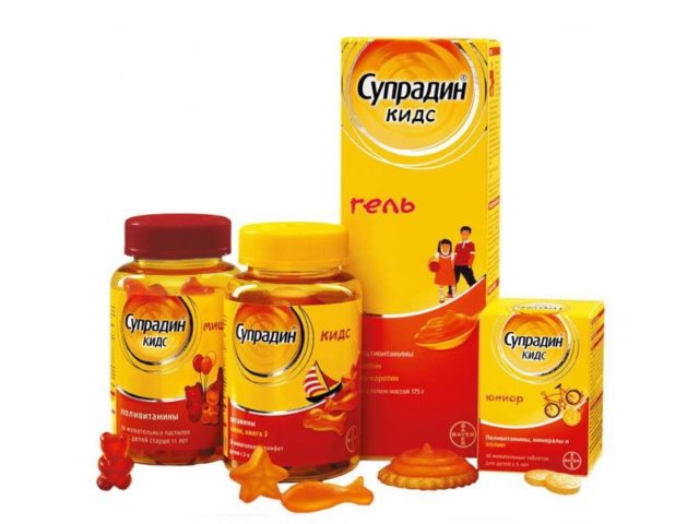 Συνιστάται σε παιδιά κάτω των 12 ετών να χρησιμοποιούν μια ειδική μορφή του προϊόντος με τη μορφή μασώμενων δισκίων, παστίλιων, τζελ και χαπιών. Από την ηλικία των 12 ετών, τα αναβράζοντα δισκία Supradin συνταγογραφούνται 1 φορά την ημέρα.