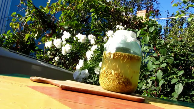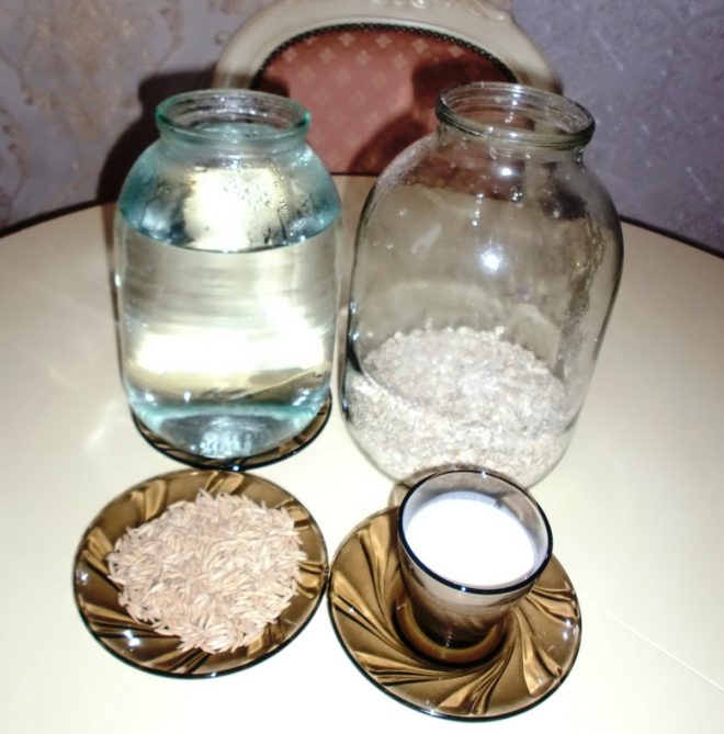 300 g απλής βρώμης, πλυμένα σε τρεχούμενο νερό, εμποτίζονται, μετά από τα οποία 3 κουταλιές της σούπας. μεγάλο. ζάχαρη και σε ζύμωση για 3 ημέρες, ρίχνοντας 3 λίτρα ακατέργαστου, καθιερωμένου νερού.