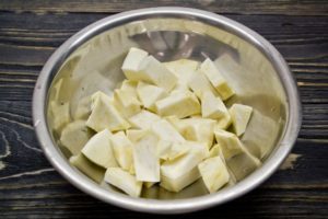 - Ξεφλουδίστε το σέλινο, κόψτε και προσθέστε στην πατάτα.