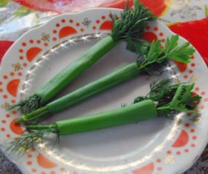 Εφαρμόστε τη φαντασία σας και καταπλήξτε όλους με μια γνήσια γαστρονομική λύση. Για παράδειγμα, χρησιμοποιώντας τα παχιά, κοίλα βέλη του κρεμμυδιού ως είδος σωλήνα για άλλο πράσινο. Σε αυτήν την περίπτωση, τα κλαδάκια μαϊντανό, κόλιαντρο ή άνηθο ενσωματώνονται μέσα στα φτερά.