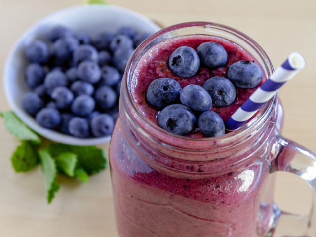 - ρίχνουμε τα φρούτα σε ένα μπλέντερ, προσθέτουμε 100 γραμμάρια βατόμουρων και 1 μεγάλο κουτάλι κάθε βακκίνιο και σταφίδες.