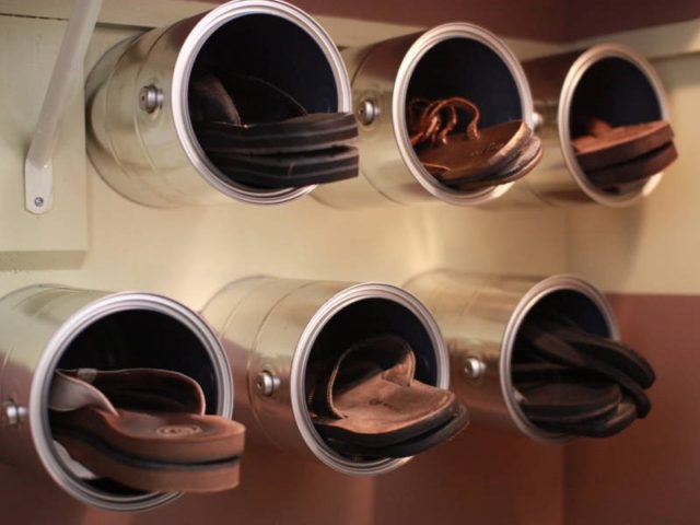 Large cans that once contained paint are great for storing compact shoes, trainers, ballerinas and sneakers. The cans must be thoroughly washed and the smell of paint removed, and then fixed on the wall in even rows and the products must be placed inside. This idea is convenient for storing children's shoes, which are small in size.