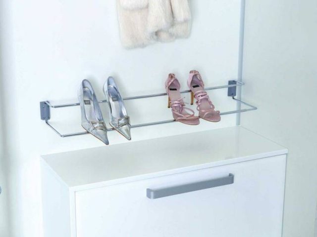 Among the photo options for storing shoes in the hallway, you can often find a very simple device - a bar fixed to the wall at a short distance. It is especially convenient to place women's boots, shoes and boots with heels on the crossbar. It is by the heel that the product is hooked to the support, due to which it firmly adheres to the bar and does not fall.