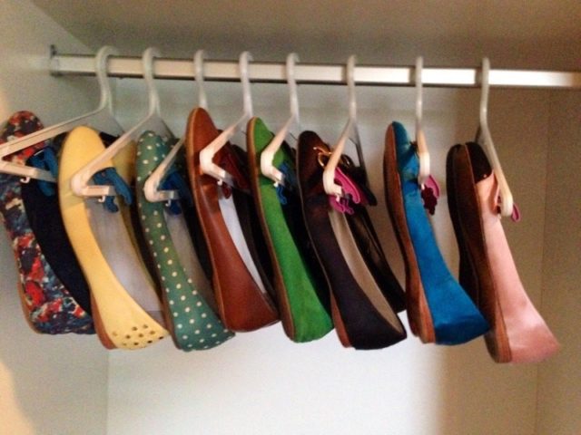 The original idea of storing shoes in a wardrobe suggests not putting, but hanging boots and boots on hangers with clips. Clips are neatly secured over the tops of boots, boots, or canvas sneakers and sneakers and place the hangers in the closet.