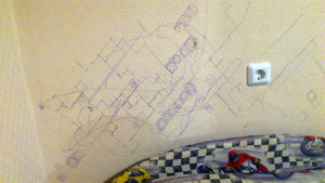 - with a cotton pad or stick, point ink marks on the wall covering.